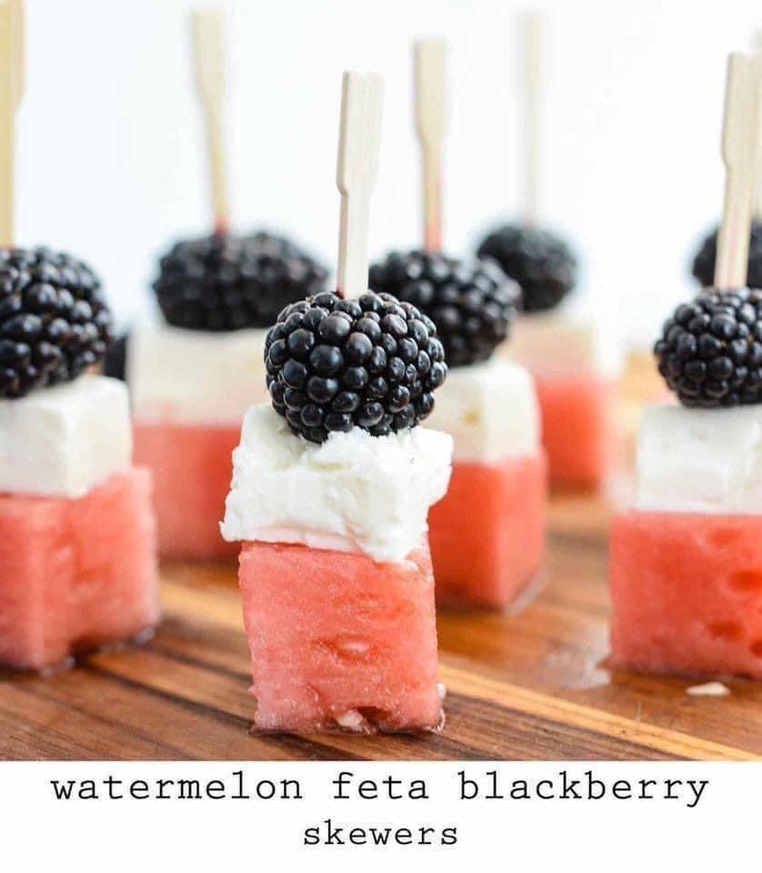 Ingredients 1 small seedless ripe watermelon, cut into 1″cubes 6 ounces of Feta cheese, cut into 1” cubes Fresh Ripe Firm Blackberries Small wooden skewers