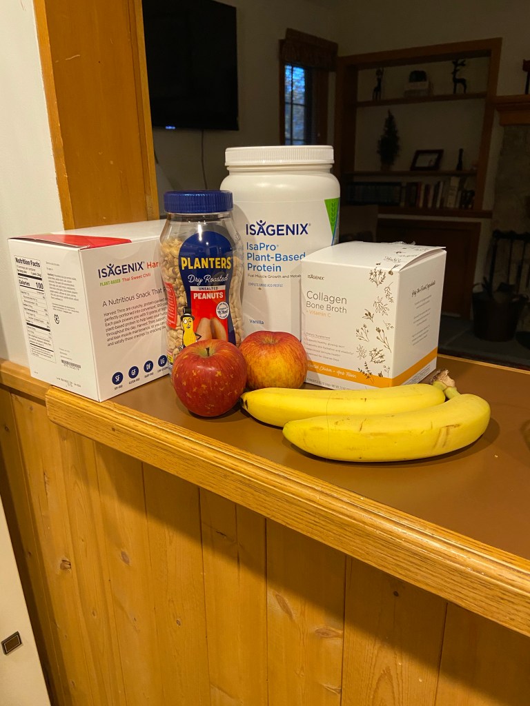 Supplements not pictured, but I always travel with my shakes, bone broth, healthier protein bars and crackers and lots of fruit and veggies